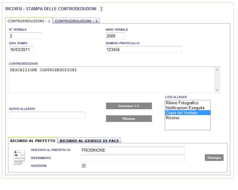 CONTRODEDUZIONI-2: ai dati inseriti automaticamente dal sistema, nella stampa delle controdeduzioni verranno aggiunte le informazioni inserite nella maschera, la lista degli allegati indicata, le informazioni selezionate dalla griglia e tutto ciò che verrà scritto dall'Agente del Comando nel campo immediatamente sotto la griglia.